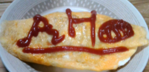 今日は、オムライス作りに挑戦しました。僕の家族はみんなオムライスが大好きです。僕は、オムライスの上にケチャップでいつもを描いて楽しんでいます。今回は僕のイニシャルA・Hと、僕が好きなバスケットボールを描きました。今回はいつもより味付けがうまくできました。卵もフワフワに焼けたので嬉しいです。フワフワに焼くコツは、卵が半熟の状態でケチャップライスを入れることです。今回は自分の分しかつくらなかったけれど、次は家族全員分のオムライスを作りたいです。