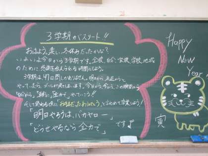 ついに3学期がスタートです。残りの短い期間でどんな姿を見せてくれるのか楽しみです。いつも僕の想像をこえた発想で驚かせてくれる子供たち。一緒にがんばろう。