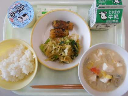 今日の献立は、ご飯、牛乳、ちくわのカレー揚げ、生姜ひたし、豆乳汁、ヨーグルトです。明日の献立は、ご飯、オレンジジュース、鰯の梅煮、煎り大豆和え、厚揚げの錦とじです。