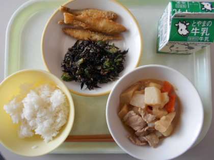今日の献立は、ご飯、牛乳、わかさぎのフリッター、ひじきのごま和え、鶏肉とじゃがいもの南蛮煮です。来週月曜日の献立は、塩だれ豚丼(麦ご飯)、牛乳、カブの彩り、ワンタンスープ、バナナです。