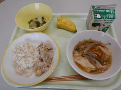 今日の献立は、塩だれ豚丼(麦ご飯)、牛乳、カブの彩り、ワンタンスープ、バナナです。明日の献立は、ご飯、牛乳、鯖の照り焼き、はりはりソテー、白菜鍋です。