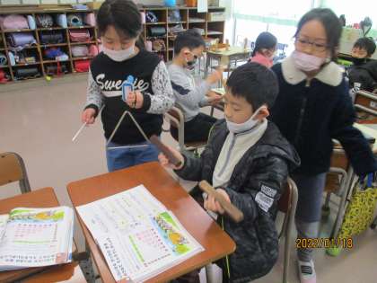 トライアングルやすず、ウッドブロック、カスタネット、クラベス、小太鼓など、様々な楽器を使って、音の重なりを楽しみました。友達と一緒に楽器を叩いたり、リズムを教えていたりと意欲的に活動していました。