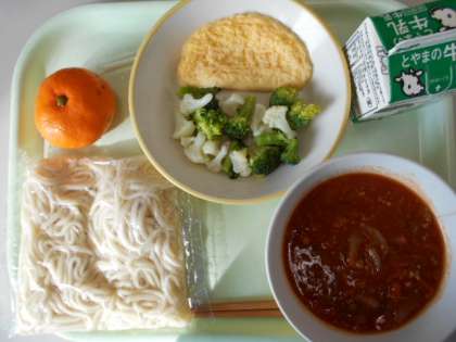 今日の献立は、ソフト麺、牛乳、オムレツ、花野菜サラダ、ミートソース、みかんです。来週月曜日の給食は、ご飯、牛乳、お化けのアッチ豆腐ハンバーグ、サイコロサラダ、野良猫スープ、苺です。