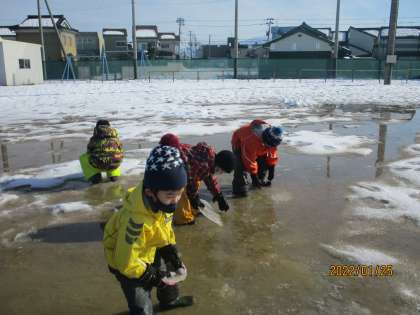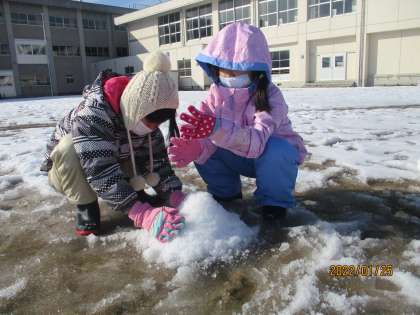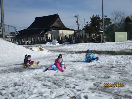 子供たちは、そりですべったり、氷みつけをしたり、雪山を作ったりと様々な遊び方で楽しんでいました。