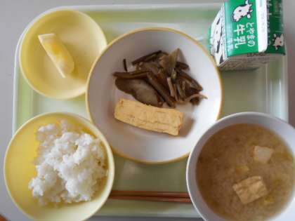 今日の本は「くまの子ウーフの童話集」です。献立は、ご飯、牛乳、厚焼き卵、まかしときっきのきんぴらごぼう、ツネタの味噌汁、りんごです。明日の献立は、食パン、牛乳、ポークチョップ、茹でポテト、ひゃくみビーンズのポトフ、チョコレートクリームです。