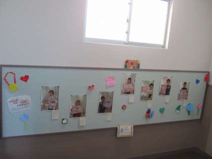 ママパパの絵のまわりには、飾り係が作った折り紙作品がたくさんあります。ママパパの絵を引き立てています。