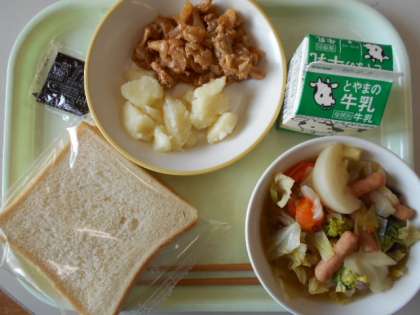 今日の本はハリー・ポッターシリーズです。献立は、食パン、牛乳、ポークチョップ、茹でポテト、ひゃくみビーンズのポトフ、チョコレートクリームです。明日の献立は、ご飯、牛乳、魚のネギ味噌かけ、ゆず昆布和え、吹き寄せ煮、おはぎです。