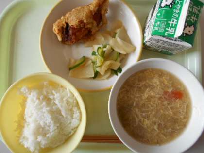 今日は1月最後の給食です。献立は、ご飯、牛乳、魚の利休揚げ、レモン和え、中華かき玉汁です。明日2月最初の献立は、ご飯、牛乳、鰯の土佐煮、野菜ソテー、豚肉とじゃがいもの旨煮です。