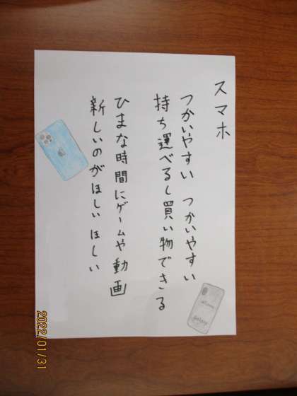 この詩は、スマホがほしい気持がつたわるように書きました。授業で初めて詩をつくったので、始めはどうしたらよいか分かりませんでした。