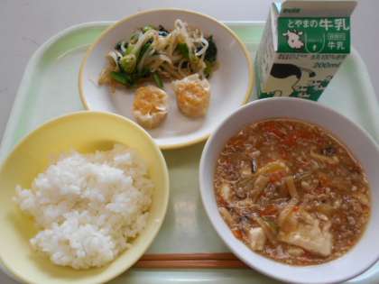 今日の献立は、ご飯、牛乳、人参シューマイ、おひたし、マーボー豆腐です。明日の献立は、コッペパン、牛乳、鶏肉のマーマレードソースかけ、フレンチサラダ、バナナです。