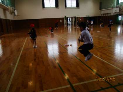 まずは、3分間持久走をしてからなわとび学習をしました。今日は、サイドクロスの練習をしました。どんどんできる技が増えています。