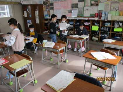 毎日たくさんの配り物があります。音読カードや健康観察カード、宿題プリントやノート。そのとき、友達の机の上が乱雑にならないように、きれいに積み重ねて配っている1年生。相手のことを思いやる心が育ってきています。