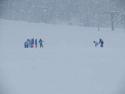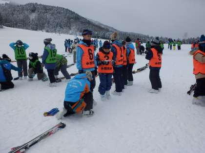 開校式の後は、班ごとに自己紹介や準備運動をしてスタートです。靴のベルトの締め方もインストラクターの方にチェックしてもらい、準備万端になったら滑り出しです。