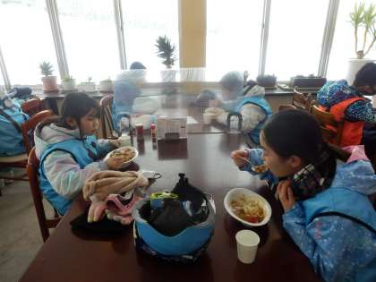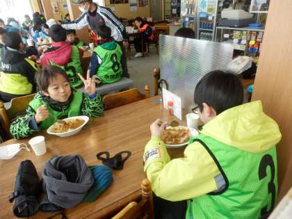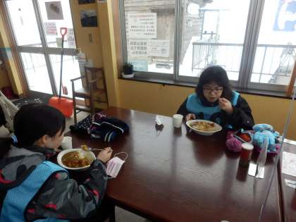 お昼はカレーライスです。給食と同じく、食事中はおしゃべりはできませんが、美味しいカレーをお腹いっぱい食べました。