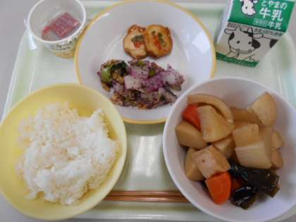 今日の献立は、ご飯、牛乳、野菜の肉巻き、ゆかり和え、おでん、納豆です。来週月曜日の献立は、麦ご飯、牛乳、ビーフストロガノフ、チーズポテト、グリーンサラダです。