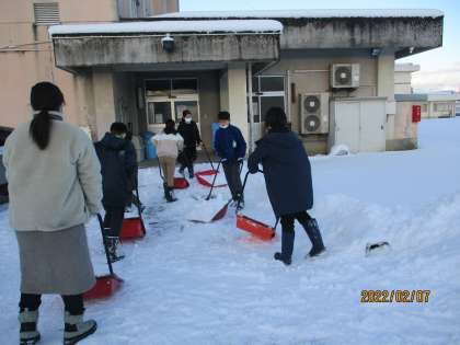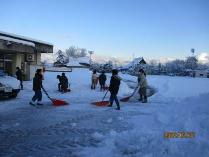 土日にたくさん雪が降ったので、今日は朝から雪よかしの作業です。広いところは除雪されていましたが、ママさんダンプを使って、給食物資の搬入口や、非常階段近く、玄関わきなどをよかしました。たくさんの人数で作業するとあっと言う間です。