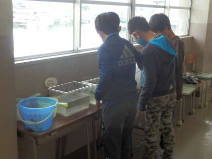 メダカのお世話中です。エサやりや、水替えなど、メダカが快適にすごせるようにお世話しています。大切に育てられている、5年生教室のメダカは幸せ者です。