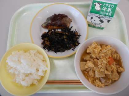 今日の献立は、ご飯、牛乳、魚の甘味噌かけ、ひじきと小松菜の炒め煮、高野豆腐の卵とじです。来週月曜日の献立は、ソフト麺、牛乳、ごまだれポテト、切り干し大根のドレッシング和え、五目あん、味付け小魚です。