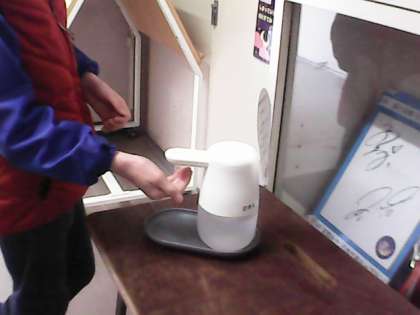 感染症の予防のために、各教室の出入り口には、手指消毒用のアルコールがあります。皆さん、ていねいな手洗いと手指消毒、換気やマスクの着用(天瀬の呼吸!)をしていきましょう。写真は、図書室前で手指消毒をしている様子です。