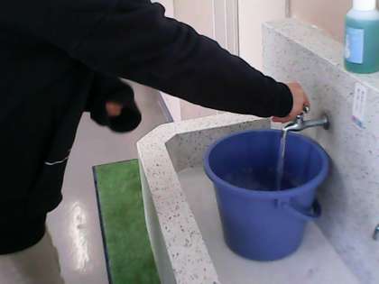 掃除の時間に、清潔な環境になるようにしっかりときれいにしました。写真は、トイレに水まきをする時のものです。