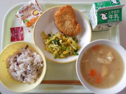 今日は卒業お祝い献立で、赤飯、牛乳、とんかつ、コーン和え、紅白白玉、豆乳プリンタルトです。明日の献立は、コッペパン、牛乳、スコッチエッグ、えごまドレッシングサラダ、ビーンズポタージュ、せとかです。