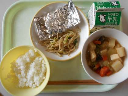 今日の献立は、ご飯、牛乳、鯖の銀紙焼き、ごまびたし、関東炊きです。明日の献立は、カレーライス(麦ご飯)、牛乳、フルーツヨーグルト、副神和えです。