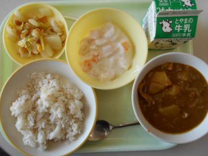 今日の献立は、カレーライス(麦ご飯)牛乳、福神和え、フルーツヨーグルトです。明日の献立は、米粉コッペパン、牛乳、海老とひよこ豆のオリーブオイル炒め、添え野菜、ポテトスープ、清見オレンジです。