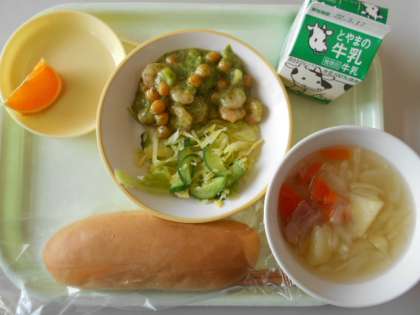 今日の献立は、米粉コッペパン、牛乳、えびとひよこ豆のオリーブオイル炒め、添え野菜、ポテトスープ、清見オレンジです。明日の献立は、ご飯、牛乳、春巻き、納豆和え、親子煮です。
