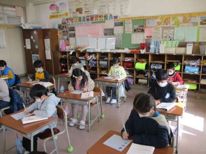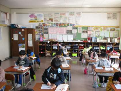 書写の時間に水ふでを使って、文字を書きました。初めての感触にどきどきしていました。