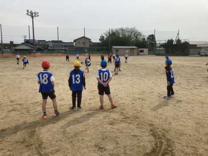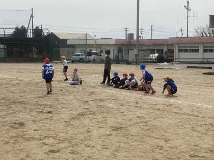50m走の計測の後、3色陣取り遊びをしました。赤は青に勝ち、青は黄に勝ち、黄は赤に勝つという三すくみのルールです。同色は、共にアウトになります。状況判断が必要な遊びで、子供たちは真剣にグラウンドを走り回りました。