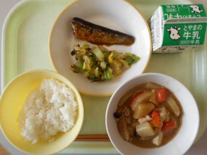 今日の献立は、ご飯、牛乳、いわしの生姜味、昆布和え、鶏肉と根菜のごま煮です。明日の献立は、食パン、牛乳、オムレツ、ビーンズサラダ、焼きそば、ポケットチーズです。