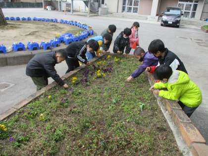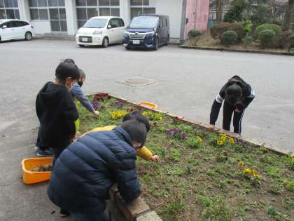 明日は、卒業式。1年生は、家庭でお祝いをしながら過ごします。そこで、卒業式に出られないかわりに、できることをしようと、正面玄関前の花壇の草むしりをしました。「ここで、記念写真を撮ってくれたらいいな」「6年生さんのおかげで、小学校生活が楽しくなったな」「たくさん遊んでもらったな」など、と思い出しながら、一生懸命に活動しました。