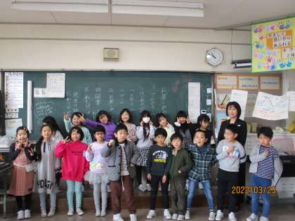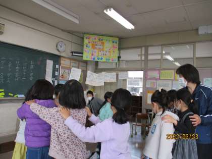 3月23日、1年間お世話になった先生とお別れをしました。2年1組最後のお楽しみ会も兼ねて、各係がそれぞれ出し物を考えて発表しました。
