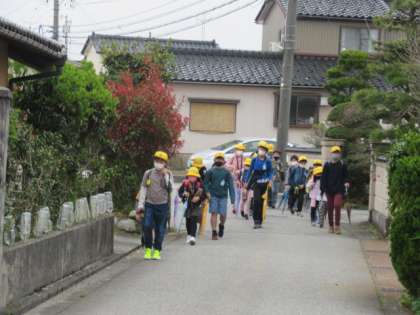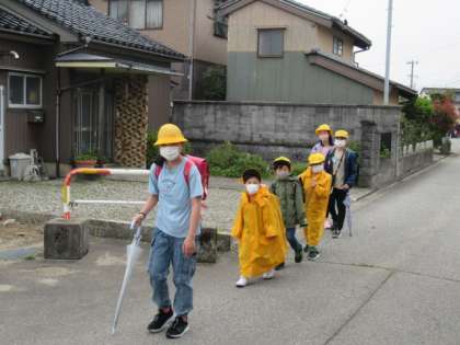 いつ降り出すか分からない雨に備えて、1年生は初の「黄カッパ」着用・・・