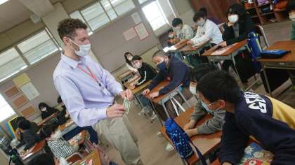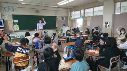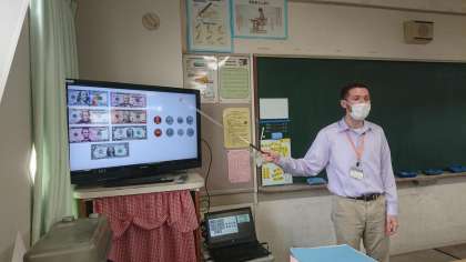 新しいALTの先生と外国語の授業がスタート。先生の出身地や家族、趣味、外国のお金についてなど、子供たちは興味津々にお話を聞いていました。