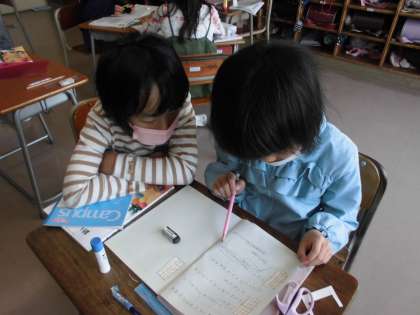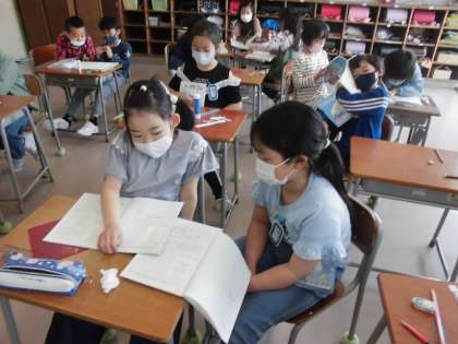 ペアで考えを伝え合っています。