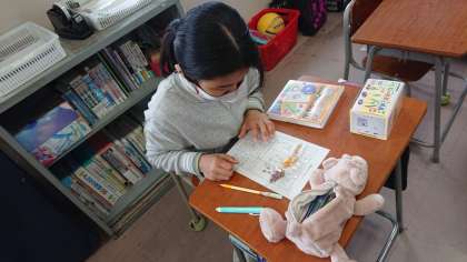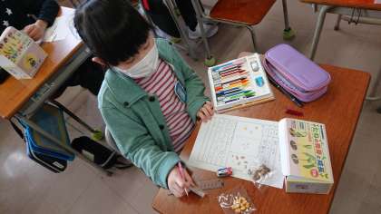 「種」の観察を行いました。インゲンやトウモロコシ、イネを観察した子供たち。形や大きさの違いをプリントにまとめました。
