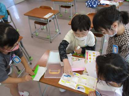 周りの友達とお話しながら、楽しそうに折り紙をしていました。