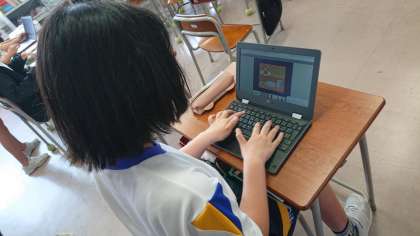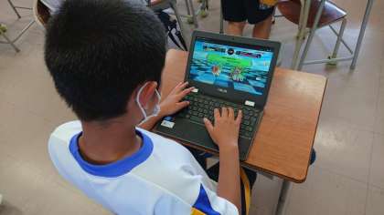 すき間時間にタイピングの練習を行っています。タイピングの技能は、コンピュータを使って文章を書いたり、検索ワードを入力したりするために必須の能力です。情報社会を生きる子供たちが身に付けなければならない力です。