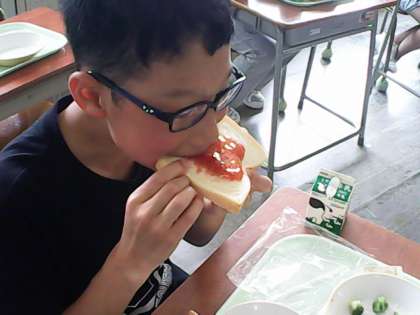 今日の給食は、食パン・いちごジャム・コロッケ・はなやさいサラダ・ひよこ豆スープでした。みんなおいしく食べています。みんなパンにいちごジャムをかけて、かぶりついて食べていました。これからもおいしく給食を食べていきます。