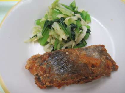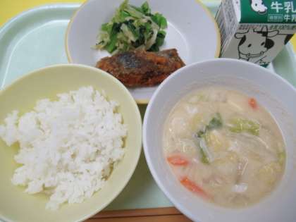 ・ごはん ・牛乳 ・魚の竜田揚げ ・小松菜ひたし ・呉汁 ※11時50分、検食終了。異常ありません。