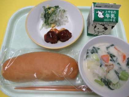 2日(木)今日の献立 公開日 2022/06/02 更新日 2022/06/02 給食室 ・コッペパン ・牛乳 ・ミートボール ・水菜のサラダ ・ほたてのクリーム煮 ※11時45分、検食終了。異常ありません。