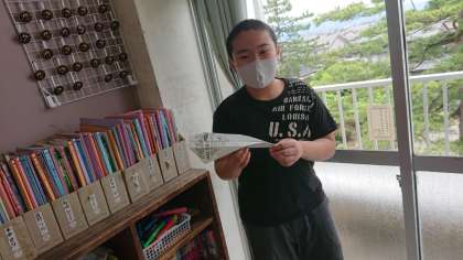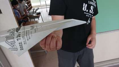 休み時間、一生懸命に紙飛行機を飛ばす人がいました。聞いてみると、よく飛ぶ紙飛行機を考案中なんだとか。これがなかなかのよく飛ぶ紙飛行機なんです。折り方を工夫すると、飛行距離が伸びるそうです。自分の思い描く理想を目指して「探求する心」、いいですね。