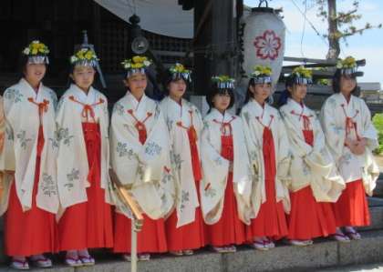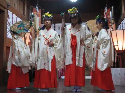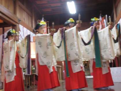 5年生が「扇の舞」(上の写真)、6年生が「鈴の舞」(中の写真)を奉納しました。