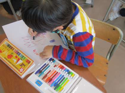 ぎざぎざの線、くるくるの線、いろんな線を組み合わせて、それぞれ個性的な絵を描きました。