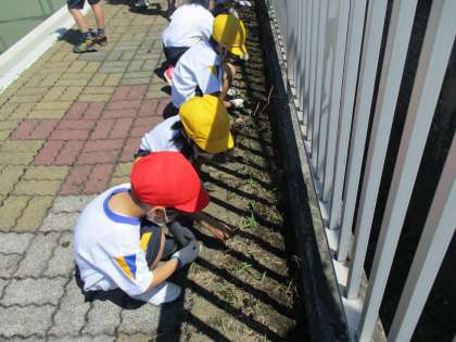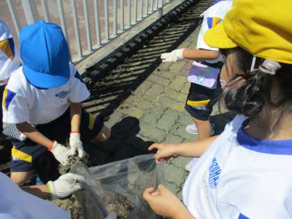 プール開きに向けて、草むしりをしました。ごみ袋がいっぱいになるまで、一生懸命がんばっていました。