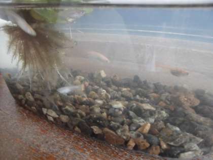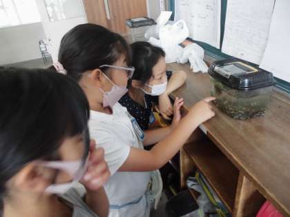 Nさんがメダカを持ってきてくれました。「かわいい〜」泳ぐ姿、えさを食べる姿に興味津々です。