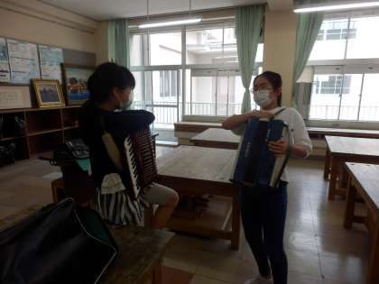 6年生 休み時間に練習☆ 公開日 2022/06/14 更新日 2022/06/14 6年生 休み時間に、音楽の楽器演奏の練習をしていました。アコーディオンの練習です。歌がとても上手な6年生ですが、合奏も楽しみです。