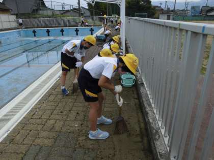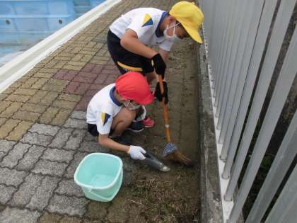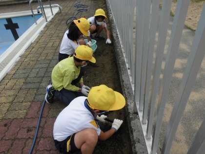 3年生はプールサイド担当です。砂を集めたりこけをとったり・・・進んで仕事を見付けて働く姿が立派です。さすが、スーパー3年生です。