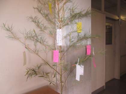 七夕の季節になりました。先日、日枝神社の奉賛会の方から大きな竹をいただき、子供たちは、早速短冊に願い事を書いて飾っています。